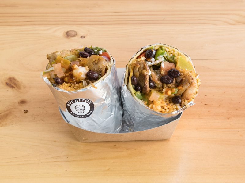 Pollo, arroz, frijoles negros, pico de gallo, maíz y la salsa de tu elección. / Chicken, rice, black beans, pico de gallo, corn and the sauce of your choice.