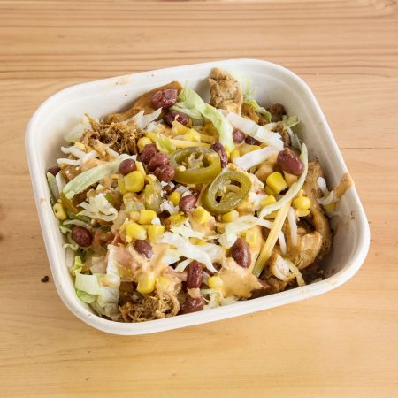 Pollo, carnitas (pulled pork), arroz, vegetales, frijoles negros, salsa verde, salsa chipotle (medio picante), pico…Add to cart $10.00 -